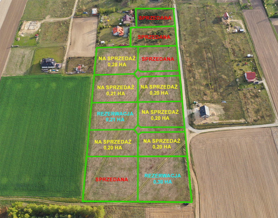Działki posiadają aktualne warunki zabudowy. Doskonale nasłonecznione, o powierzchni 2000 m2 oraz 2100 m2, o prostokątnym kształcie, dają możliwość racjonalnego zagospodarowania o płaskim ukształtowaniu terenu. Wszystkie działki znajdują się w zasięgu infrastruktury technicznej w drodze głównej: prąd, woda, kanalizacja. Dojazd do działek drogą gminną.
